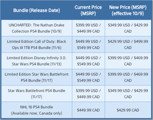 Potential Playstation 4 owners will be happy to hear that the console has now dropped $50 to $349 in North America just in time for the holidays. We’re assuming that the price cut was made to compete with the Xbox One’s temporary holiday price cut from last year that turned into the permanent price. All of the various PS4 bundles have also received price cuts. The chart below will give you the run down on all of the new prices. For all of those folks hoping to nab a PS4 for Christmas this year, this new price will make it a little easier on shoppers’ pocketbooks.