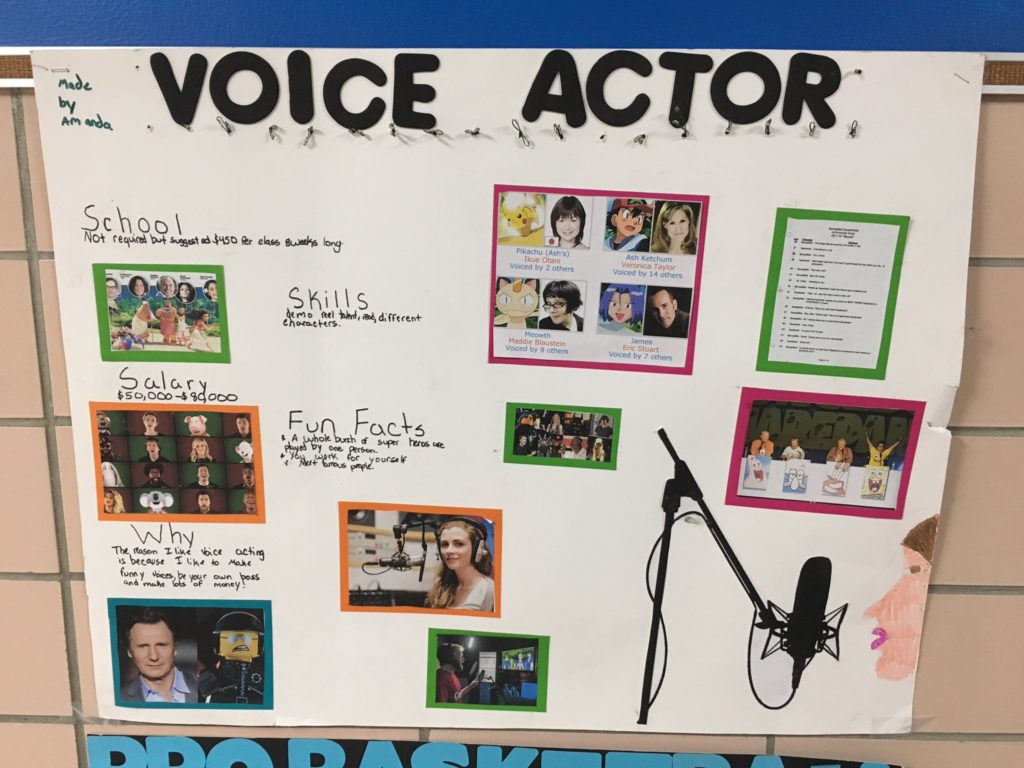 Students were encouraged to make posters about their desired careers, and one poster displayed proudly in the hallways of the school caught my eye. A third grader by the name of Amanda let the school know that she wanted to be a voice actor. She put a lot of work into her poster, which included a drawing of a woman using a professional microphone complete with a boom and shock absorber. With the help of her mother, Angela, she even attached blinking lights (powered by a concealed battery) near the top to attract attention.