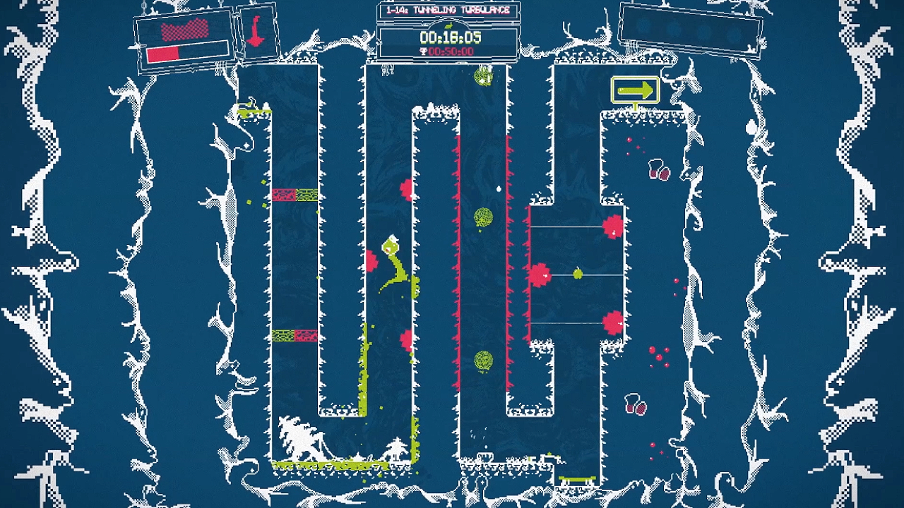 In the beginning you have to “slime climb” and move forward along though the levels. You quickly learn that you have a few tricks up your sleeve to help you survive. These include a dash that allows you to break through small chunks and the ability to phase to pass through objects. You also have the ability to slow time down to help navigate some obstacles which would otherwise seem impossible to pass by.