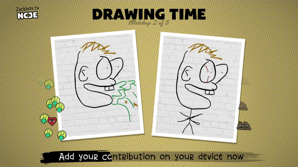 The last game in this collection gives player an opportunity to draw on their devices, similarly to how they did in “Drawful” on a previous party pack. The difference here is that the final drawing ends up being a joint project from each player who won individual matchups.