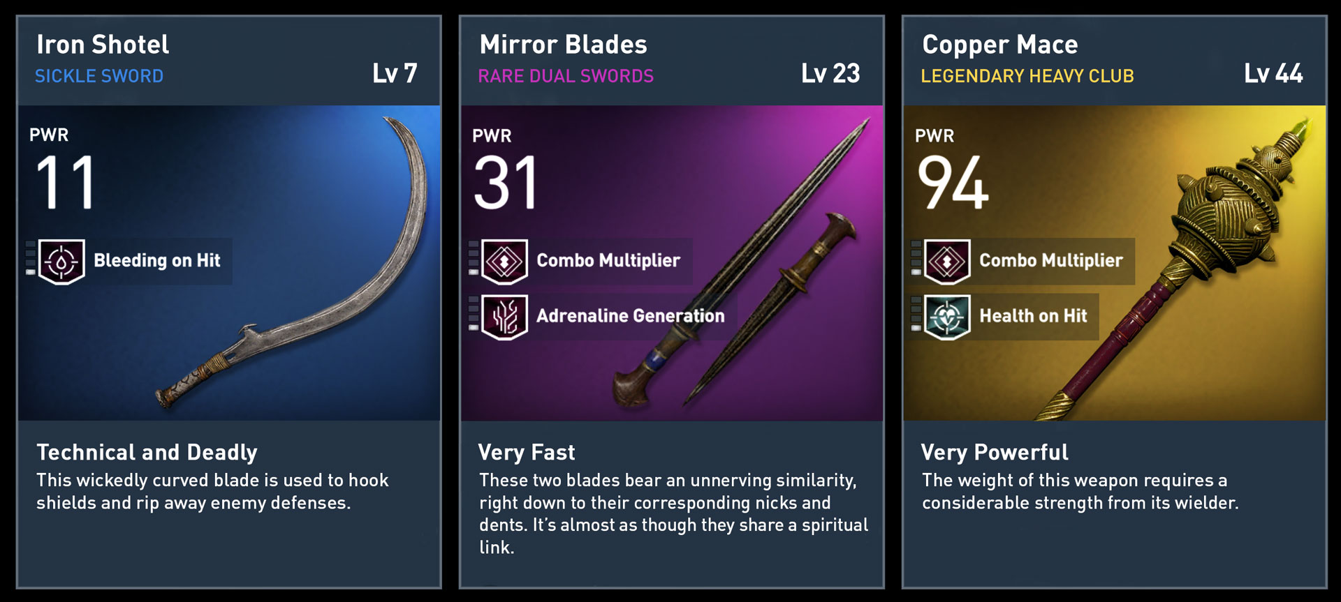Which brings me to my next point that is vastly different for the Creed series. Bayek has a leveling system, which includes stat-based weapons and shields. While the level caps at 40, it still took me that number of hours to reach it. The weapons themselves have a numbered level to them, which means you can’t use them until Bayek’s level matches the weapon’s. Furthermore, the weapons have varying degrees of rarity, each offering better bonus stats. One might offer additional health upon each kill, while another might give you a combo multiplier.