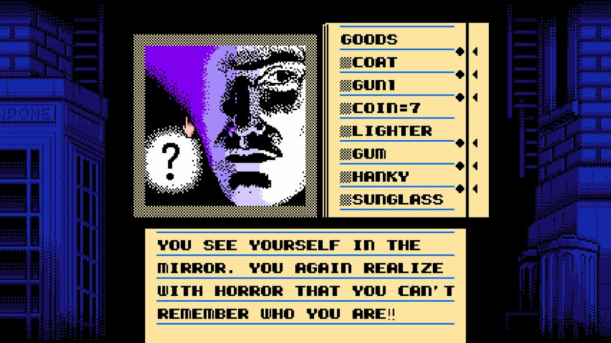 The 1986 release of Déjà vu chronicles the following of a man who wakes up in a bathroom stall. He has no recollection of who he is or what has happened to him. As you find clues, your character has bouts of (yep, you guessed it) déjà vu. These glimpses into your past eventually help you piece together the mystery surrounding your identity.