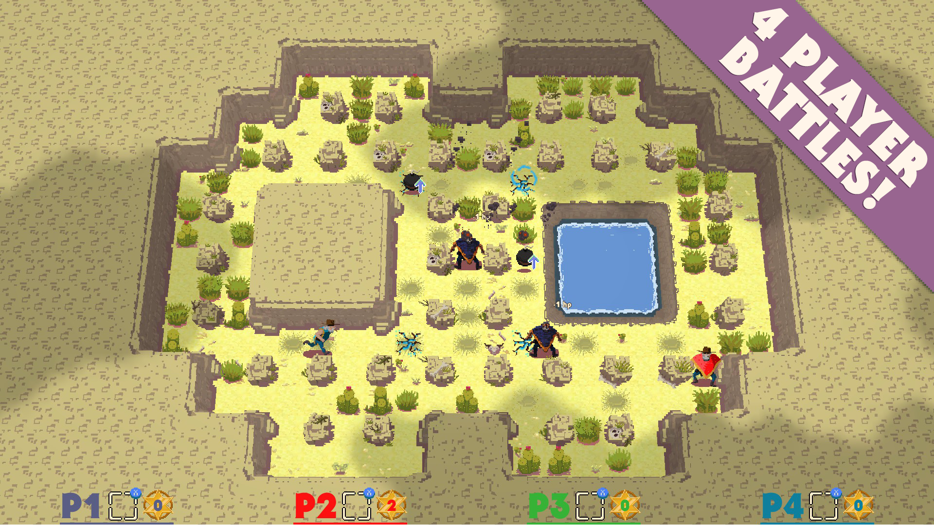 McMean was the leader of a gang of bank robbers until he met his future wife. All he wanted was to settle down at his ranch, but the rest of the gang didn’t take kindly to his leaving. They burned his ranch down with Mrs. McMean inside. Avenge your bride in the single player Adventure mode. Start at your homestead, bomb your way through randomly generated maps, blowing up enemies and obstacles like cacti and fire. At first, you only have your trusty bombs to help you, but you can unlock new items through achievements and in-game chests. Earn more items with every playthrough, allowing you to add more health, bombs and power at the start of each game. Pick up shotguns, nuclear bombs and other weapons along the way to defeat pitchfork-wielding pioneers, gun toting law enforcement, and even your former crew. All the while making sure not to blow yourself up, of course.