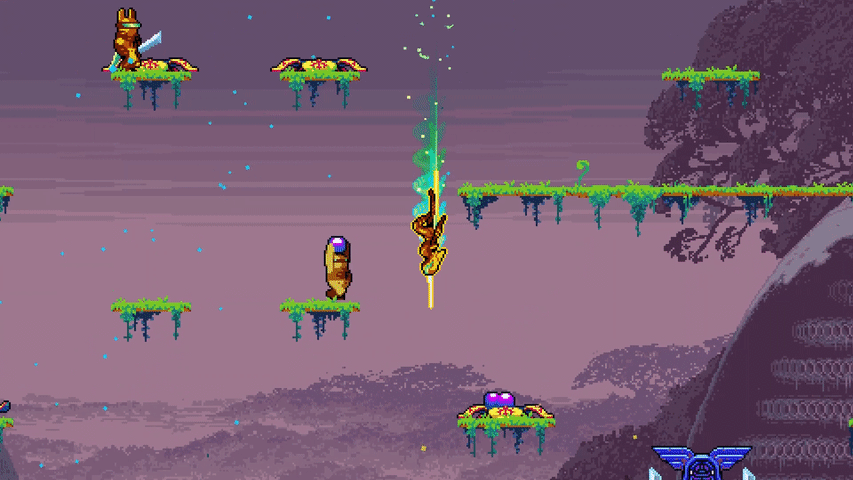 The Glam Rock-inspired 16-bit art-style will require some rocking new tunes, so instrumental power metal cover band Powerglove will provide the theme and end-of-level stingers. Check out the game’s brand-new second trailer for a taste!
