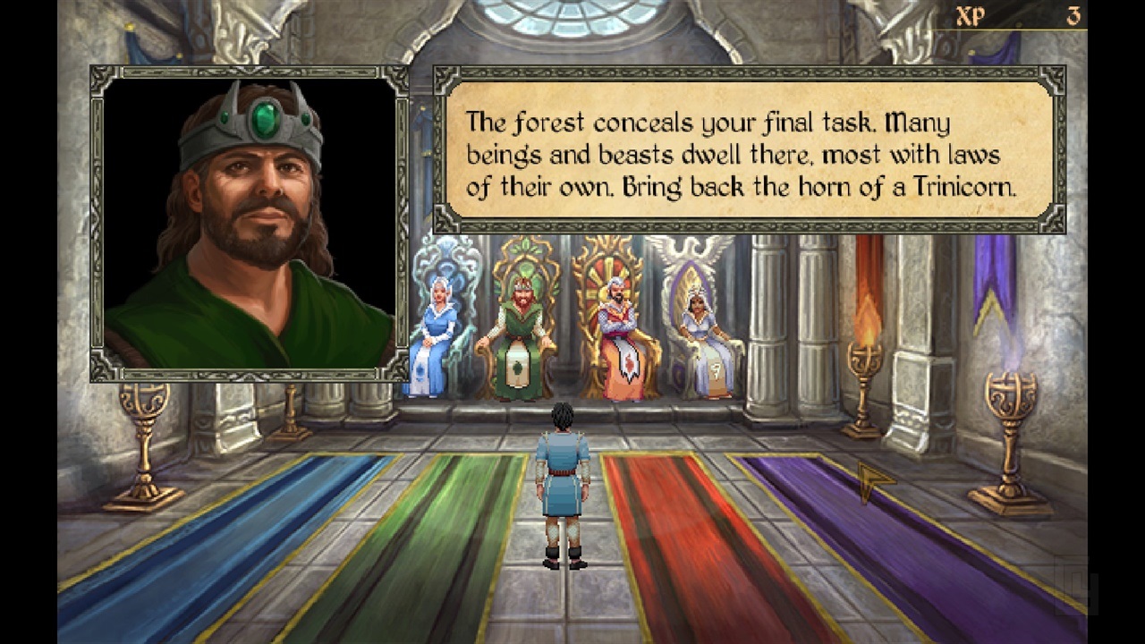 The game’s graphics are charmingly old-school pixel art. There are some beautiful shots in the game and the animations runs really smoothly. The cut scenes between chapters are a different kind of animation, a more traditional one. This I liked a bit less, as it clashed a bit with the pixel art. It worked really well to propel the story forward though, by showing some plot development as D’Arc is trying to finish his initiation quests. All characters are voice acted, and the music adds to the high fantasy atmosphere.