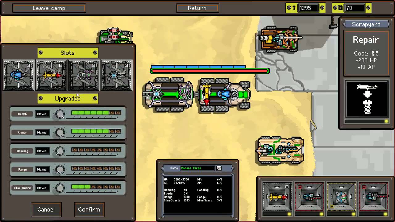 For a game that is marketed as a roguelike, this game doesn’t feel like one at all. It takes an incredible amount of time to gain a permanent upgrade, and when you do receive one, it is in the form of a new vehicle. These vehicles don’t feel like upgrades at all. They are mostly cosmetic changes to your loadout with slightly different slots for upgrades. These upgrades are usually in the form of a weapon (red), utility (yellow), or MCV specific (gray). While having a variety is a nice touch, if you cannot survive long enough to gain them through battles they feel more or less useless.