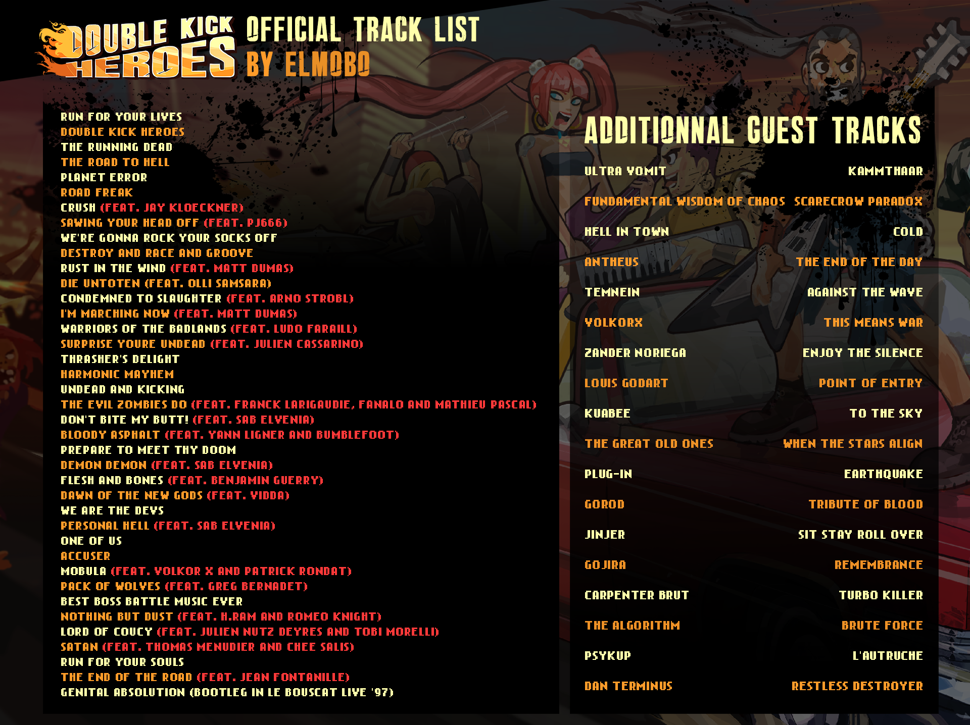 As much as I love metal, I’m ashamed to say I was unfamiliar with any of the artists on this list. That doesn’t speak to the quality of the musicianship, however, as almost every track is very well-produced and fitting with the theme of the game. Many of the songs appear to have been composed just for the game, and I appreciate the sheer number and variety of songs present here. I’ve actually been listening to it on Spotify as well. It’s solid.