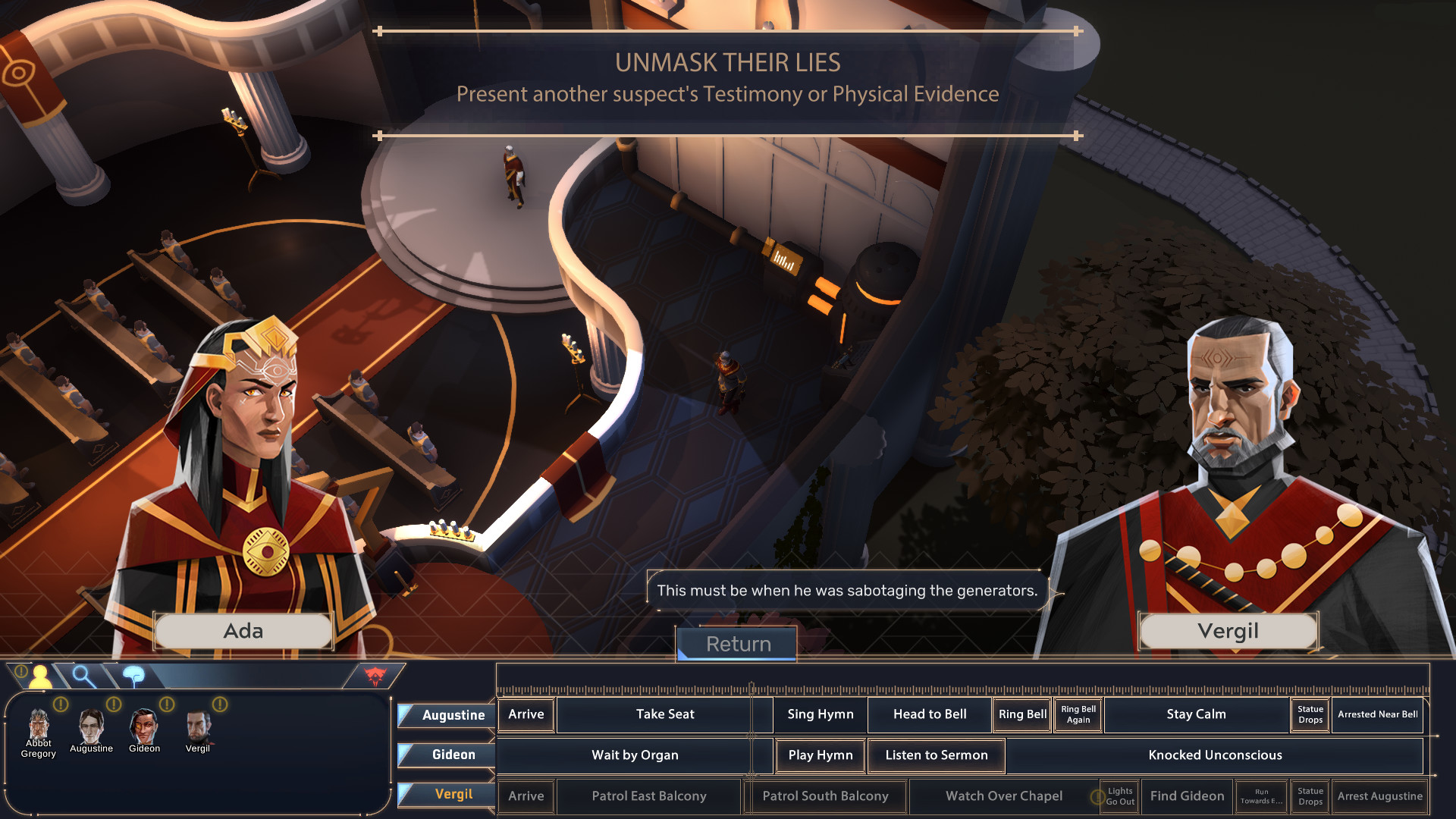 In Lucifer Within Us, you play Ada who is sent to St. Walpurga Abbey to investigate a suspicious death. Ada is a digital exorcist working for the Church of Ain Soph’s Inquisition. This means she can detect what is in people’s hearts, detect daemonic presence, and get rid of it. For that, she needs to first establish a correct timeline, find the evidence, confront the suspects with their lies and find the holes in their explanations. This is not easy and requires multiple rounds of interrogations and examinations to get to the truth.