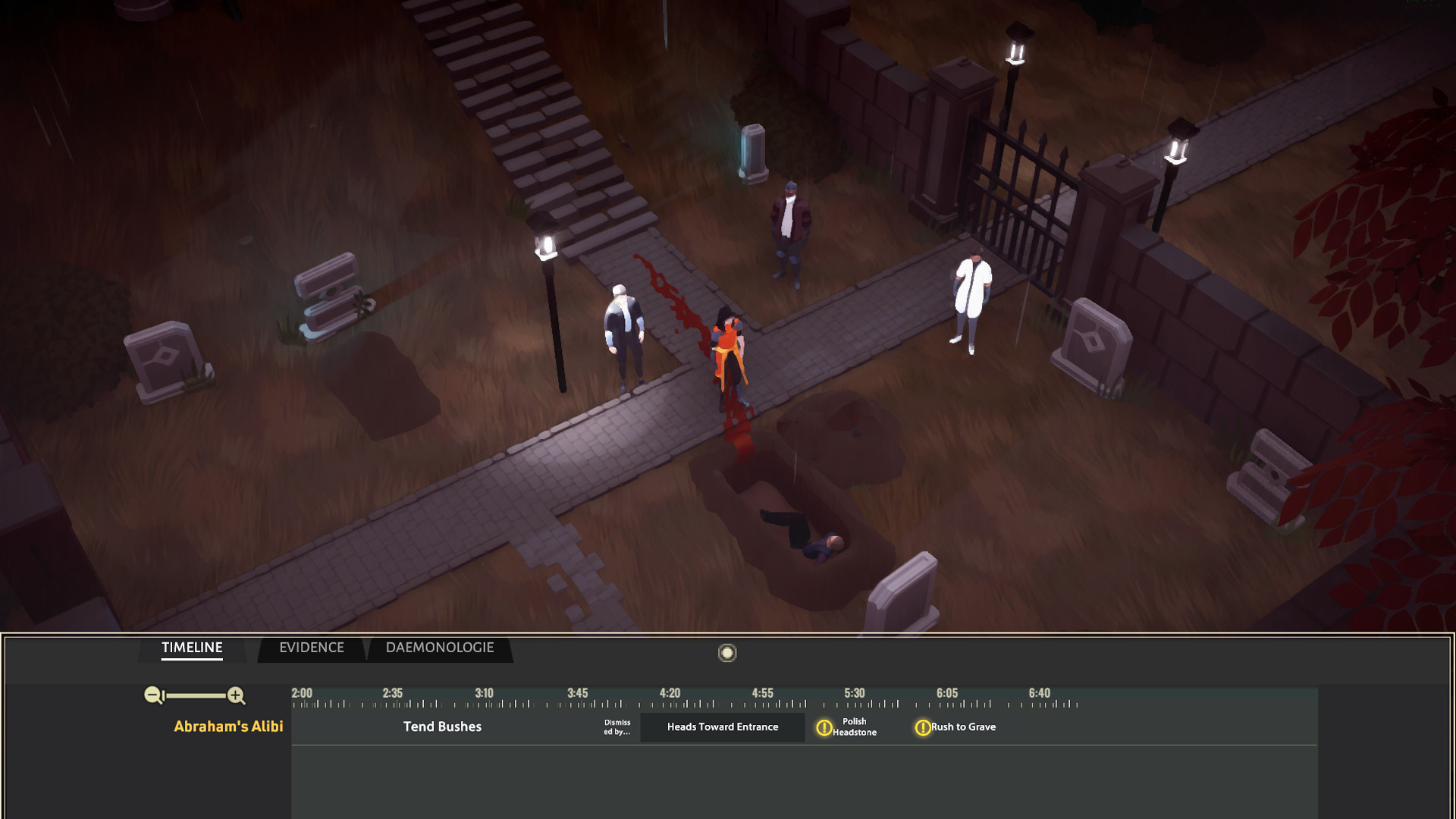 Lucifer Within Us is a procedural, isometric adventure game with point-and-click mechanics. You control Ada by having her explore the crime scene, add evidence to her notes and talk to suspects. This is all collected in the lower part of the screen, where there are tabs for the evidence and suspects, and a big area for the suspect’s testimonies. This is a very important area, as this is basically where you solve the crime. You do this by questioning the suspects and comparing their testimonies, and then confronting them with evidence that exposes their lies. Eventually, this will lead to you finding the killer and the daemon possessing him. So, from your point of view, there are two victims. It’s up to you to save them both. It’s what Ain Soph would want.