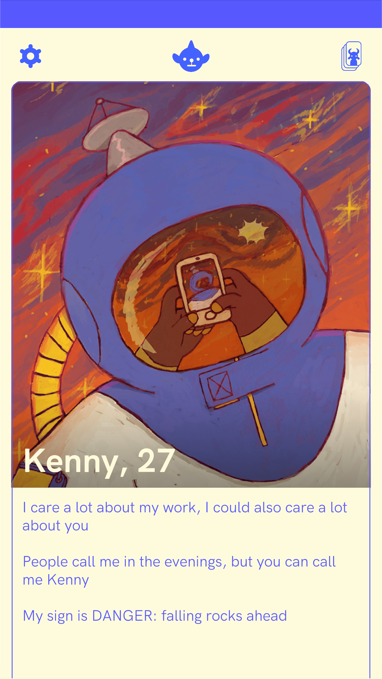 You are a human who has recently broken up with their partner and has decided to travel to the planet Comfortix to try to find a new love. On this planet, the residents use an app called Tender to talk to matches and see if they gel with anyone. As soon as you boot up the game, you’re instructed to select from one of four photos to set as your profile picture and are given a handful of funny lines to create your bio. After these steps, you’re free to start swiping on potential love interests. It feels exactly like an actual dating app, with the game having you swipe right on anyone you’re interested in and left on those who aren’t your cup of tea. I really loved this aspect and highly recommend playing on mobile if possible for the best experience.