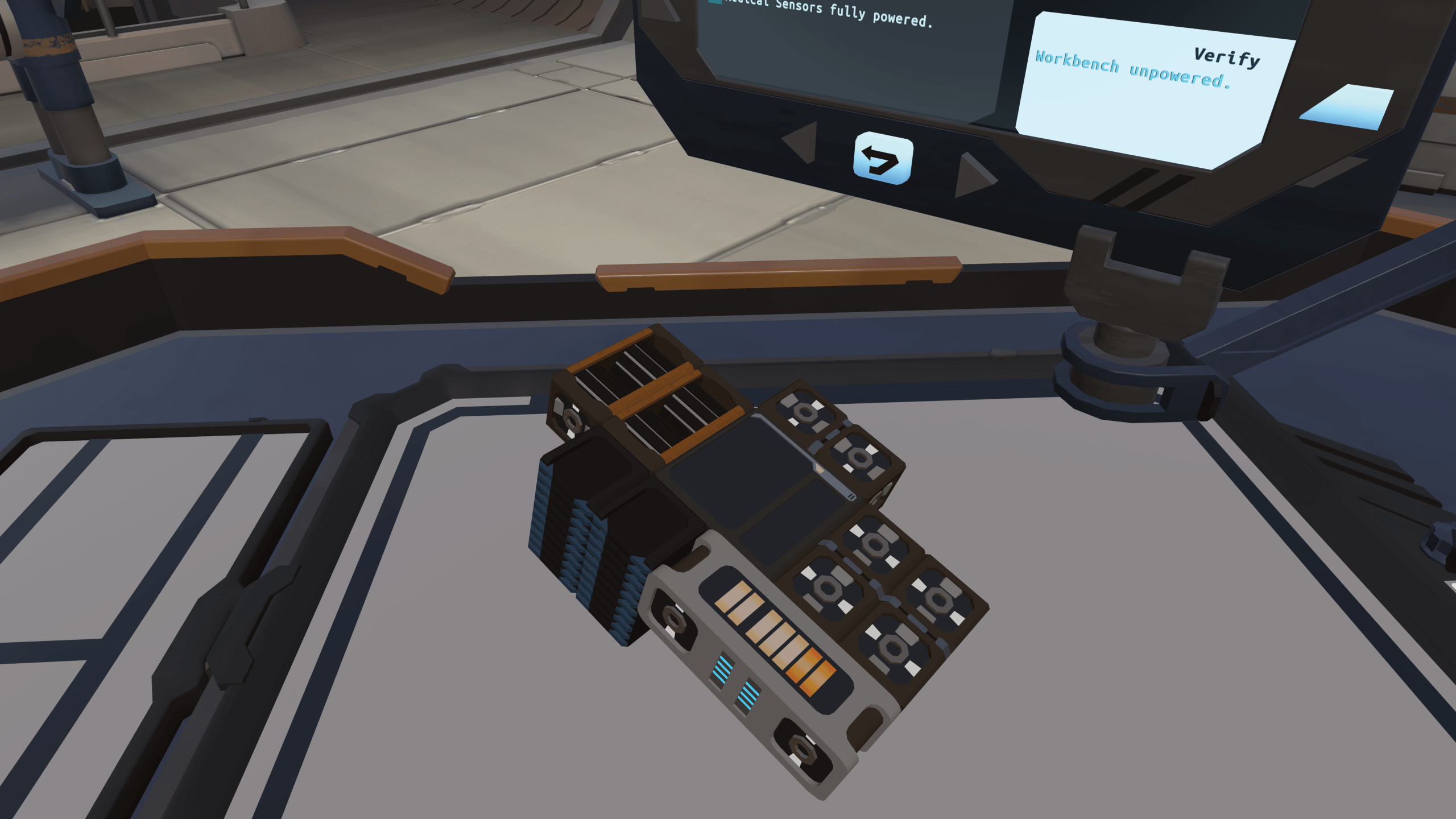 The meat and potatoes of the game takes place at a workbench. Yes, you’ll be in a seated position for the entirety of Arcsmith. Each of the Oculus controllers in your hands acts as an engineering tool. You can grab objects, flip them around, and connect them to other components like a digital LEGO set. You even have to freedom to make personal adjustments to your monitor, which sounds like it’s not that big of a deal, but it’s a godsend when you realize you can.