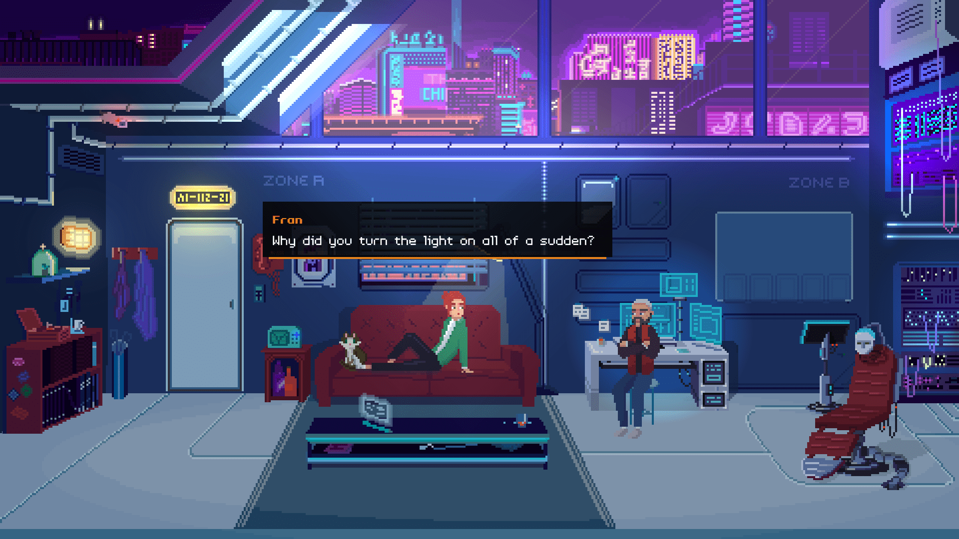 The pixel art graphics lean heavily into the cyberpunk tropes, and this works excellently. Pixel art lends itself well for the neon glow of cyberpunk futuristic design, but also the noir side of the game comes across well. Same with the music in the game. Bernard likes to listen to jazz while he works, so there is a great jazz score in the game. There is no voice acting, but that was not something I missed. The game works very well without it.