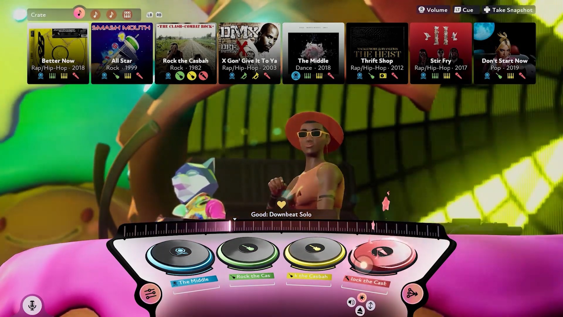 As you would expect, you play as a DJ attempting to entertain a massive festival-sized crowd with popular music. At the beginning of each set, you’re given a selection of up to sixteen songs. You can choose which songs will be in your set if you like. You have at your disposal four different turntables, each one representing one aspect of the mix you create. There’s percussion, bass, melody, and vocals. When you drop a track into your mix, it will only play one of those parts of the song you chose. Your end product is a mix of four different songs as one, each adding its respective portion. The game changes the BPM automatically so everything synchs up nicely.