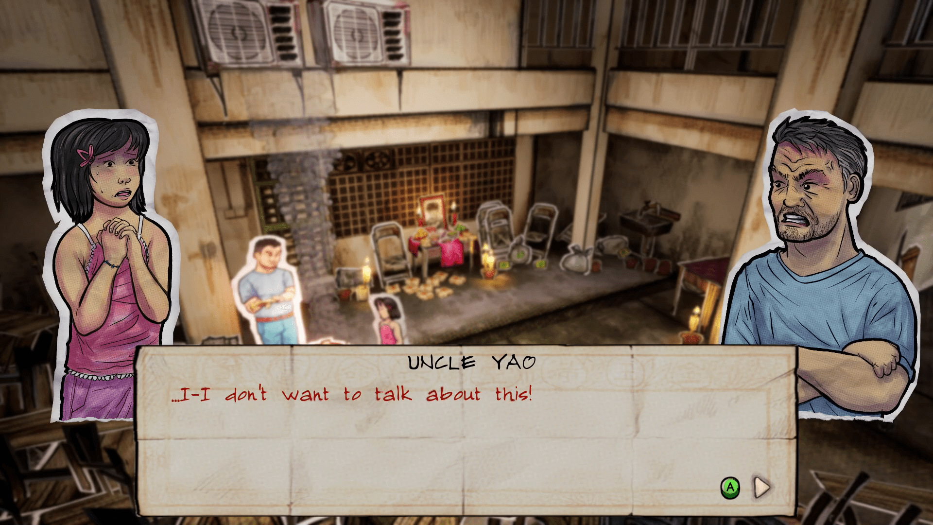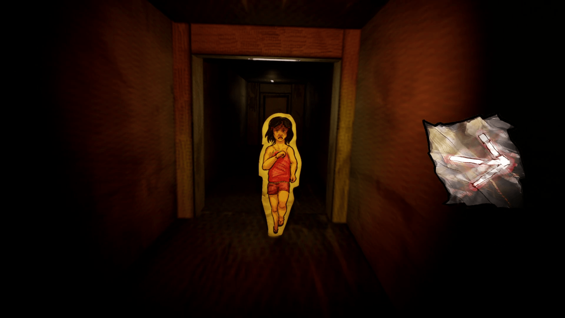 The nightmarish apparitions aren’t the only things that are paper dolls in Paper Ghost Stories: 7 PM. Each character is also a paper doll, and the entire world is made out of paper as well. I loved this unique visual style and spent way too much time just looking at the details of mundane objects. This also adds an odd creepiness to the entities of the game as well, with their stilted movements and their sinister, drawn on facial expressions. I’ve never encountered this aesthetic in a horror game before, and it’s an effective method of providing visual scares. I also appreciated the footnotes the developers included during the segments of dialogue. Malaysian words and phrases are used, and these were an immense help in fully grasping what I was reading.
