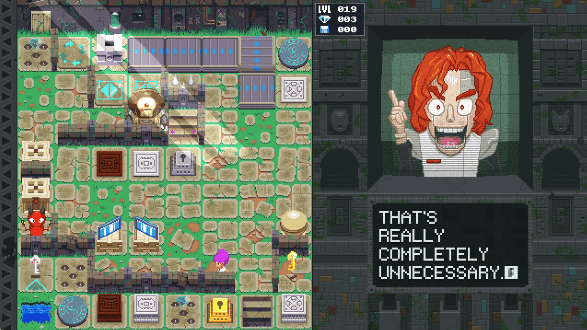 The game’s sprites and artwork look pretty great. I didn’t even touch on the humor present here as well. One of the many antagonists will pop up in a window on the right side of the screen while you solve puzzles. They will constantly berate you for the choices you make, and the writing is pretty hilarious. Unfortunately, someone like me saw this dialogue over and over again as I struggled to figure out what the game wanted me to do on each stage. The repetition obviously has a negative affect on how enjoyable it is.