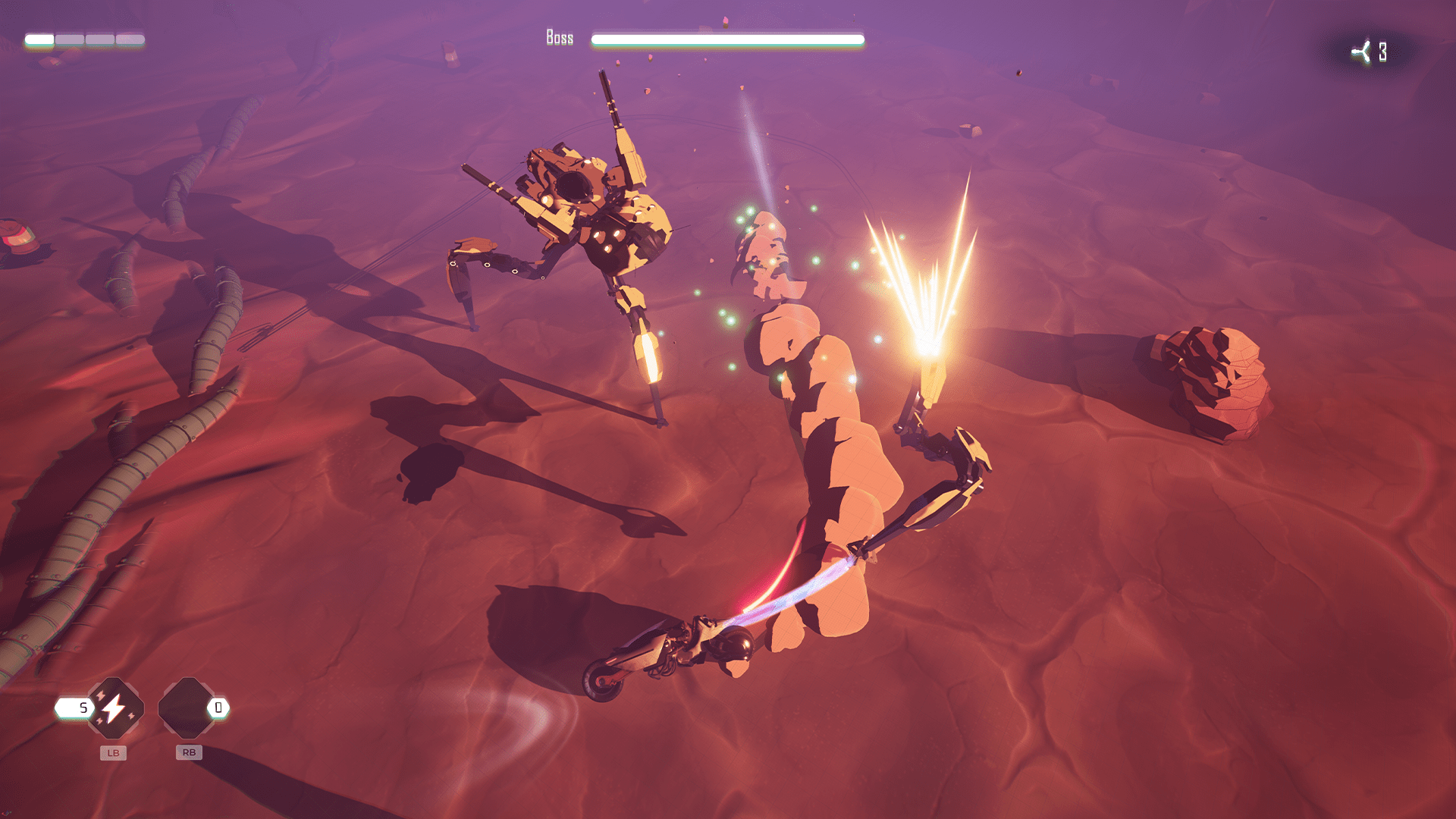 While I always appreciate a good story, Gripper didn’t intrigue me because of its story, but for its motorcycle-based action gameplay. Gripper consists of five arena-style boss fights in which you fight by using a hook attached to your motorcycle. Even though each boss is unique in both arena and attack pattern, I found there was not much variation between each boss. The strategy is very similar between the first and third boss (throw objects to damage), as well as the second and fourth boss (avoid attacks and pull apart boss). You gain a new ability after each of the first three bosses, but this does not add enough to make each boss feel fresh.
