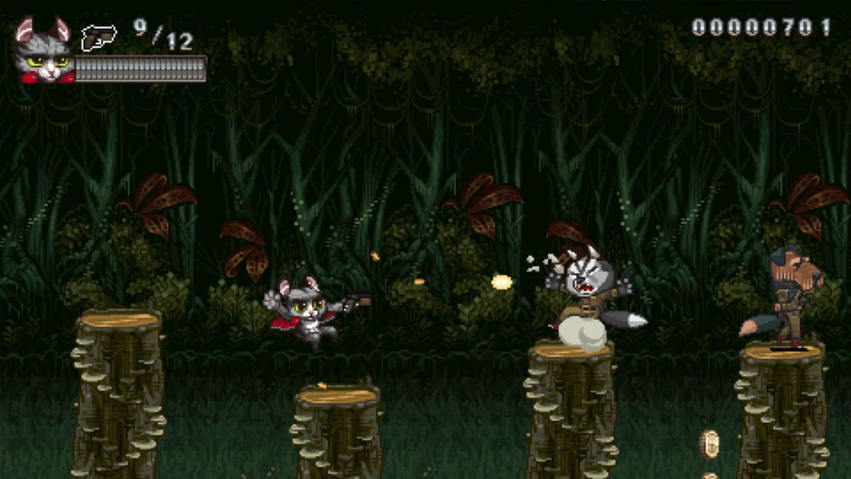 Super Catboy‘s gameplay is also very reminiscent of the 16-bit era of games, but not the ones I think of most fondly. The majority of the game consists of 2D platforming sections. Catboy has a combo melee attack as well as a handgun with limited ammo. As you’d expect, you’ll find more ammo dropped by defeated enemies, along with tuna cans for health regeneration. You can even jump on the heads of baddies, who by the way take the form of canines walking around on their hind legs. There’s nothing here to rewrite the book on game mechanics. And it doesn’t need to be anything else. It’s clear the developers wanted to tap into nostalgia more than anything else.