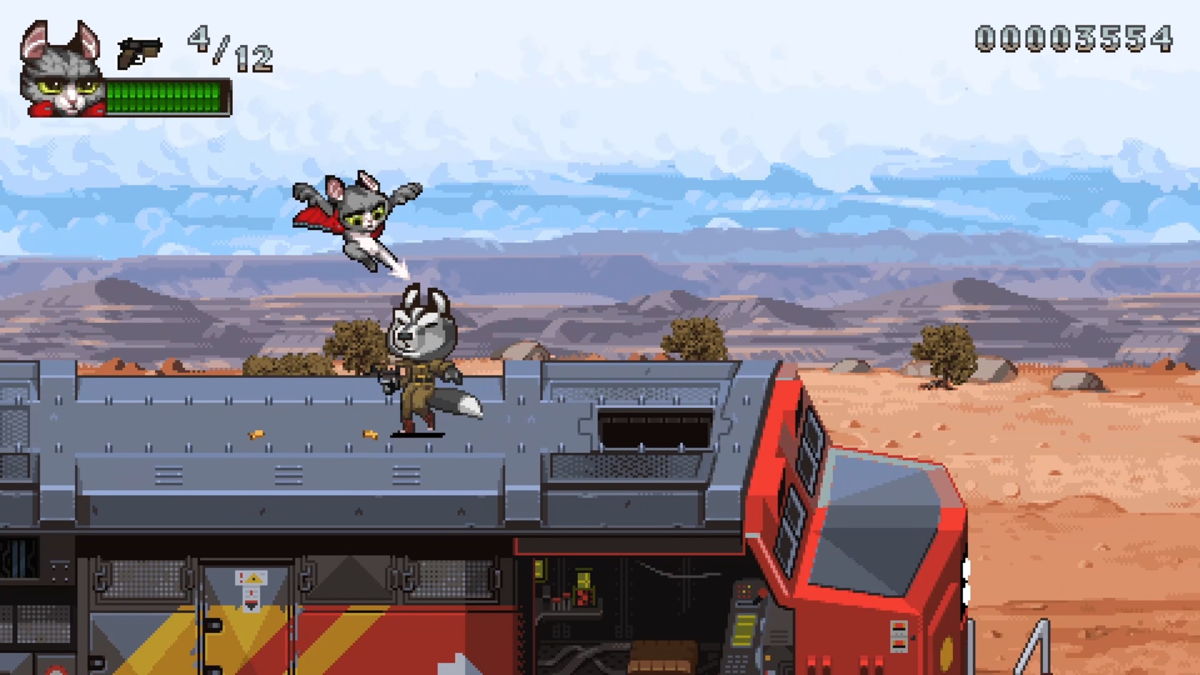 Super Catboy isn’t based on any property that I’m familiar with. Unless I’m mistaken, this is a fresh story with its own set of characters. For “reasons” explained in the opening cut scene with visuals, Catboy appears to be have been some kind of genetically-engineered creature. He crash lands on Earth, and a young girl armed with multiple firearms stumbles across them. The pair decide to team up to thwart the evil plot of a nefarious, mustache-twirling villain.
