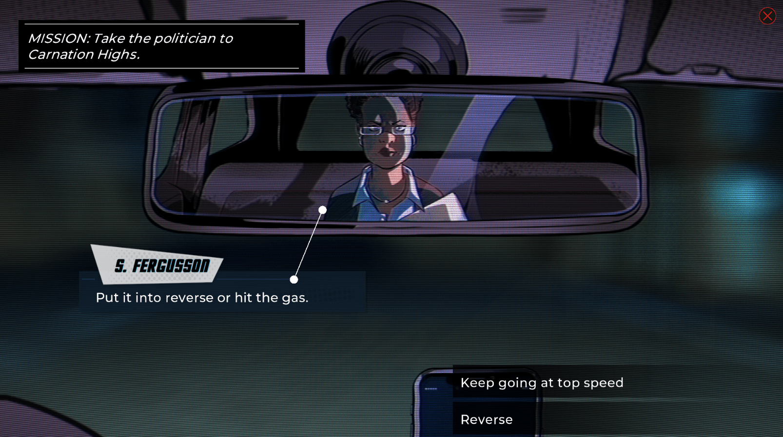 I was only able to play three of the twelve gameplay episodes during the Early Access period. The graphical style switches to a first-person viewpoint as you drive, and you have limited control. You don’t actually operate the vehicle yourself; all you can do as the player is look in the rearview mirror to talk to clients and/or to see if anyone is chasing you, select dialogue options, and decide what actions you’ll take via text prompts. This could be a con for some gamers who were hoping to actually be able to drive in REARVIEW MIRROR, but I actually enjoyed having the wheel taken away from me. It allowed me to become absorbed in the story, even if I could only play thirty minutes before reaching a screen informing me that that was all I could experience at the moment.