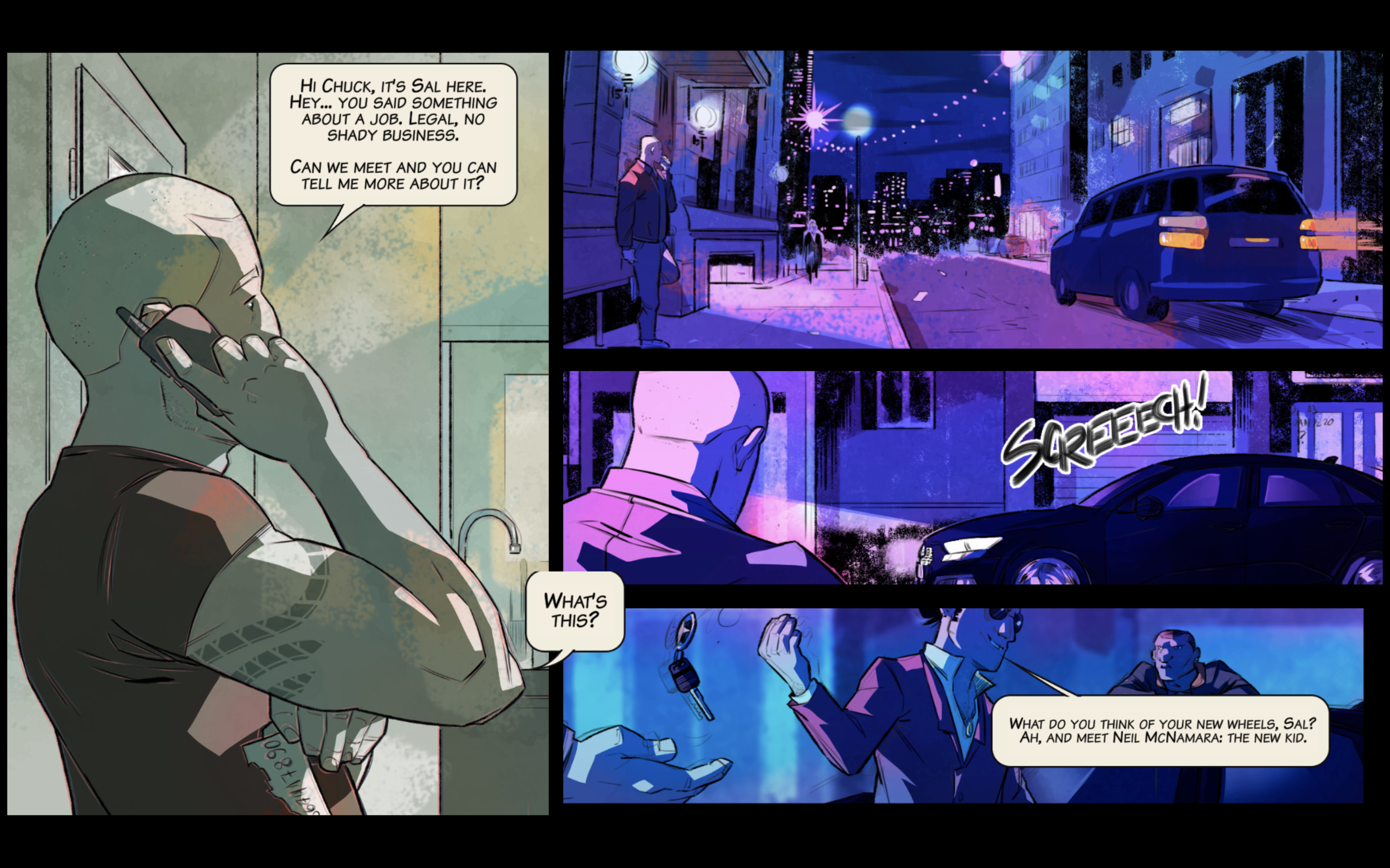 REARVIEW MIRROR has a unique visual style, which ties into the gameplay itself. There are comic book interludes mixed in with the twelve episodes of the game, and these segments are stunning. You simply tap the screen of your Steam Deck to go to the next comic panel, and when it’s time to make a crucial choice, two separate panels pop up. They each depict a certain outcome. Click on the one you want, and bada-boom, your story has branched off in a different direction. The sound effects are also excellent. You’ll hear tires screeching, doors opening and closing, and gunshots during these interludes.