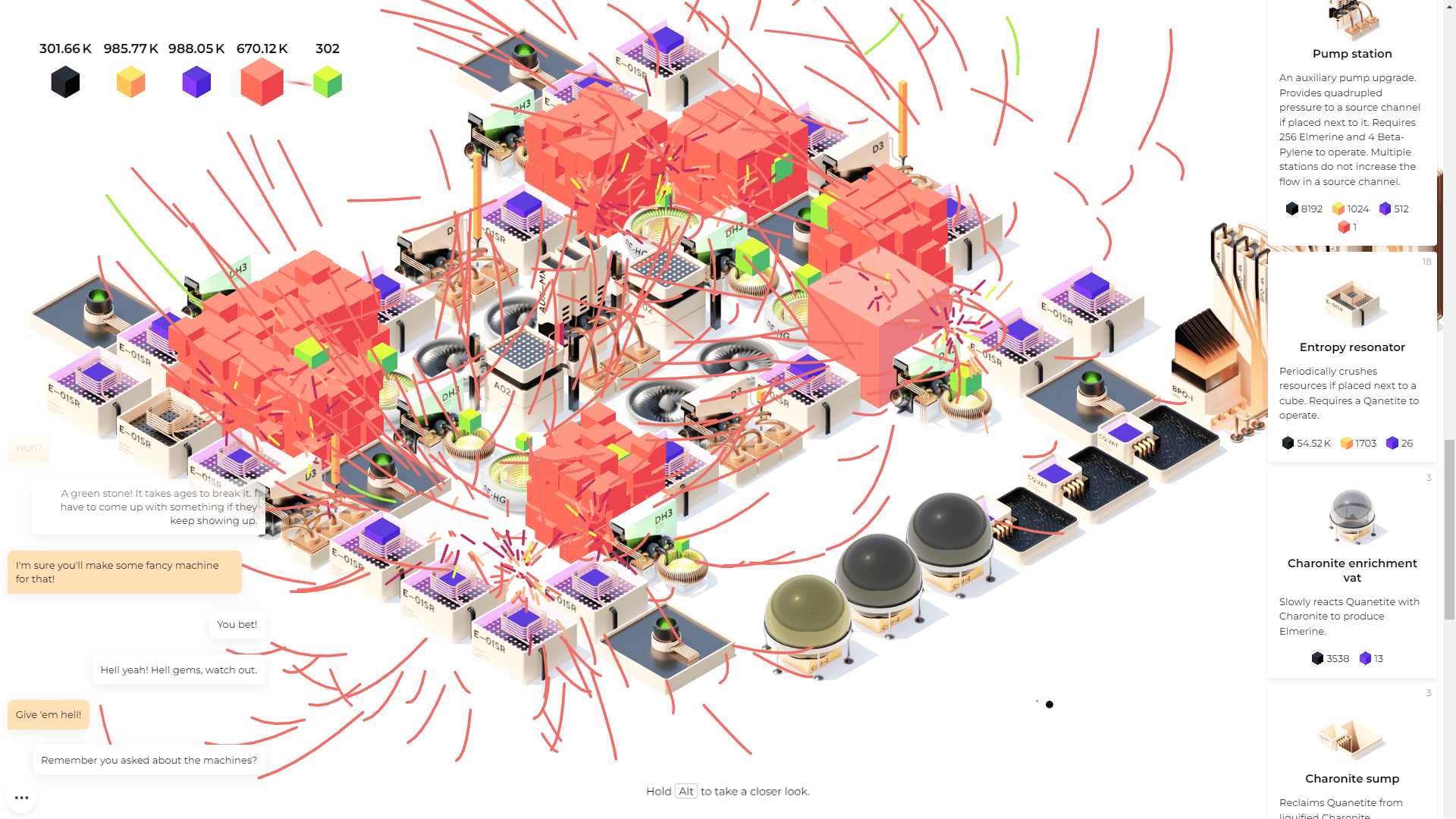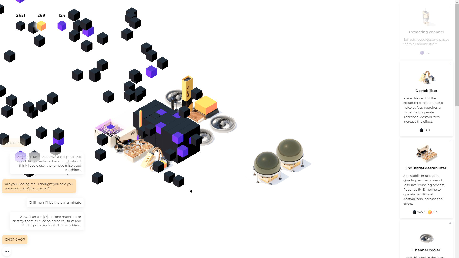 Your friend wants you to come hang out, but you have found this machine. You have to activate it. We’ve all walked down the seasonal aisle and felt the urge to “Try Me.” It feels similar here. You just activate the machine, it builds eight sets of blocks which you click with your mouse to break apart. The broken pieces get automatically collected and stored, and the number of pieces of different elements are tracked in the upper left. You use these elements to unlock and purchase new machines. As automation becomes part of the game, you can also use these elements to power those machines.
