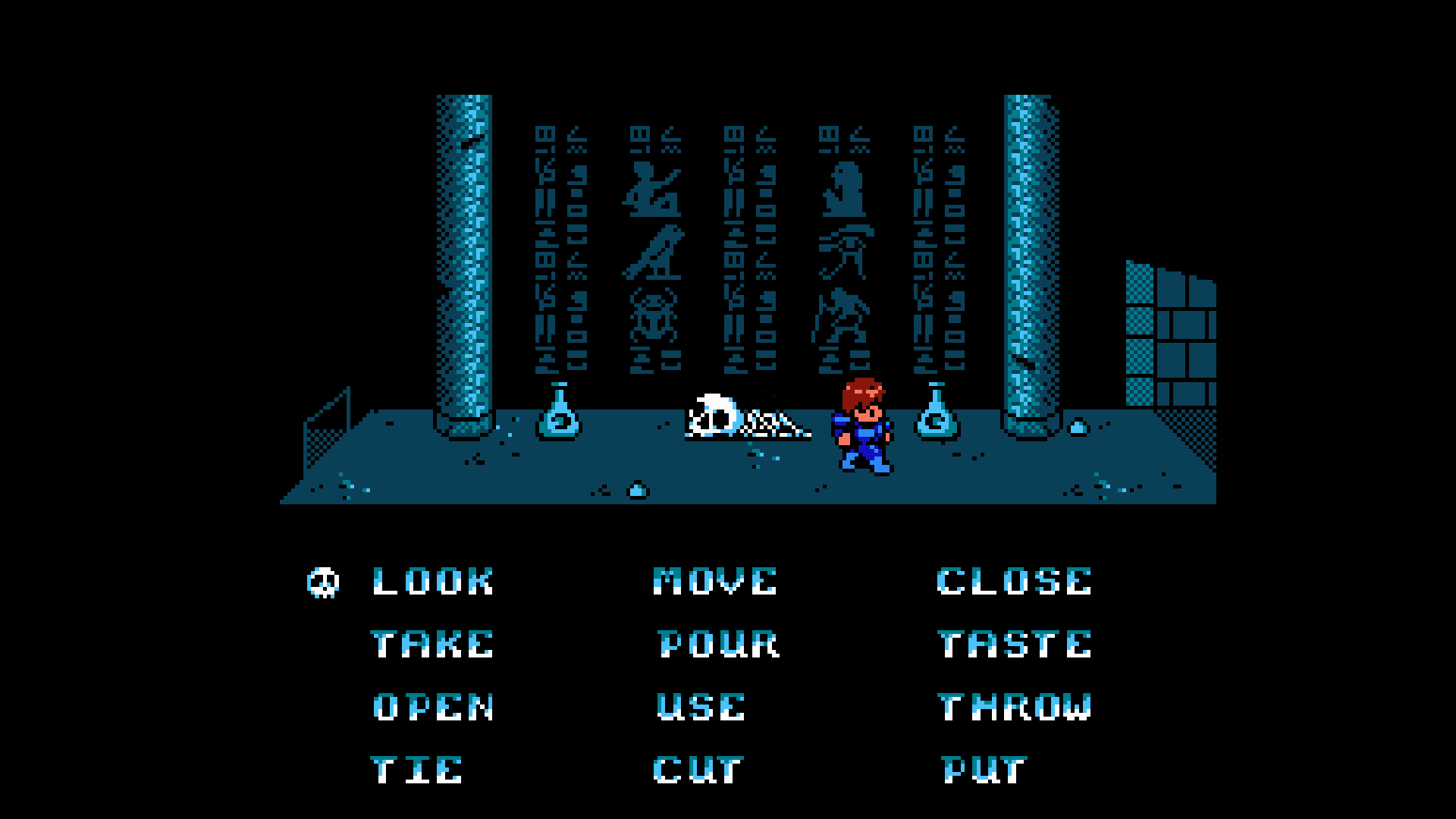 Most of the graphics in Dead Tomb are exactly what you’d expect from an NES title. The dungeon design is rather elaborate, however, and there are very few empty spaces. This gives you lots of opportunities to pixel hunt and discover clues to your next objective. One rather nice touch, however, are the transition screens when you move from room to room in the pyramid. The pixels are highly detailed and add an atmospheric element to the game, even though you only see them for a few brief seconds.