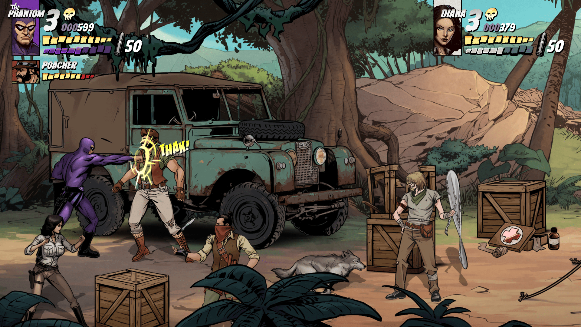 Development studio and artistic developer Art of Play Interactive with publisher King Features brings us the classic comic hero in an arcade brawler style. This new title in the Beat-’em-Up genre brings along a beautiful art style that grabs your attention. The gorgeous hand-drawn environment brings the comic to life as we defend Bengalla against piracy, injustice, and greed. “The feared pirates of the Singh Brotherhood are battling for power and threatening The Phantom‘s legacy.”
