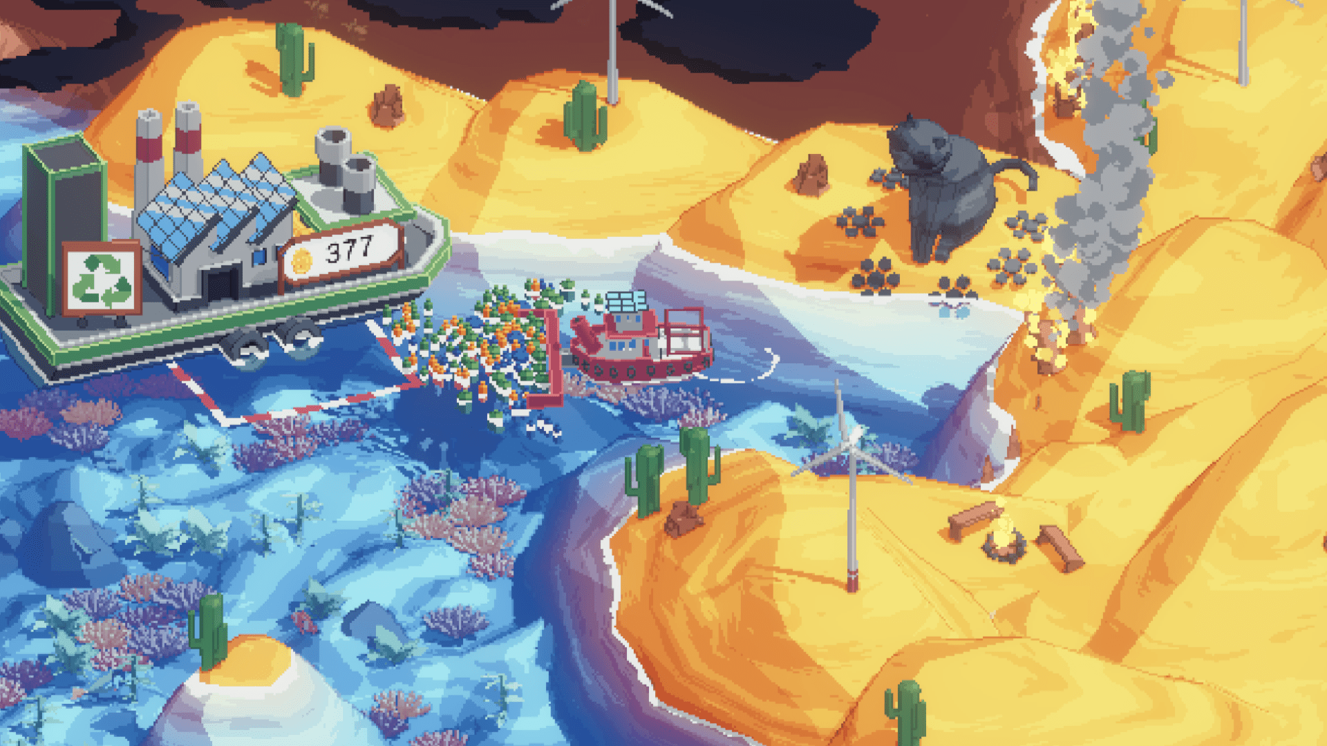 This is the definition of a cozy game. There’s not time limit, so you’re free to take as much time as you need to rid the world of waste. This was a definite plus for me, as I despise timers with a passion. There’s no real challenge here whatsoever. Even the collectibles, which are animals to rescue, are right out in the open and nearly impossible to miss. As you navigate each area, you’ll learn new skills like dredging the bottom for polluting barrels, shooting water on the shore to put out fires or clean away oil, and even cover the coast in snowballs for some reason. The game culminates in a boss battle of sorts where you shoot water at an offending tanker in an attempt to sink it. The idea being that this will stop it from polluting the waters.