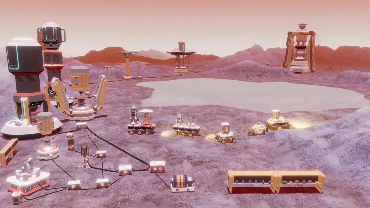 The basic gameplay loop is similar to other survival slash factory games: gather resources, build structures like power generators and terraforming devices to alter the planet, and as you progress through the terraforming tiers, you gradually unlock blueprints for more advanced machinery you can use to either terraform faster or take on brand new tasks. It’s your standard dopamine drip skinner box treadmill, and it works on a basic level to keep you engaged and progressing.