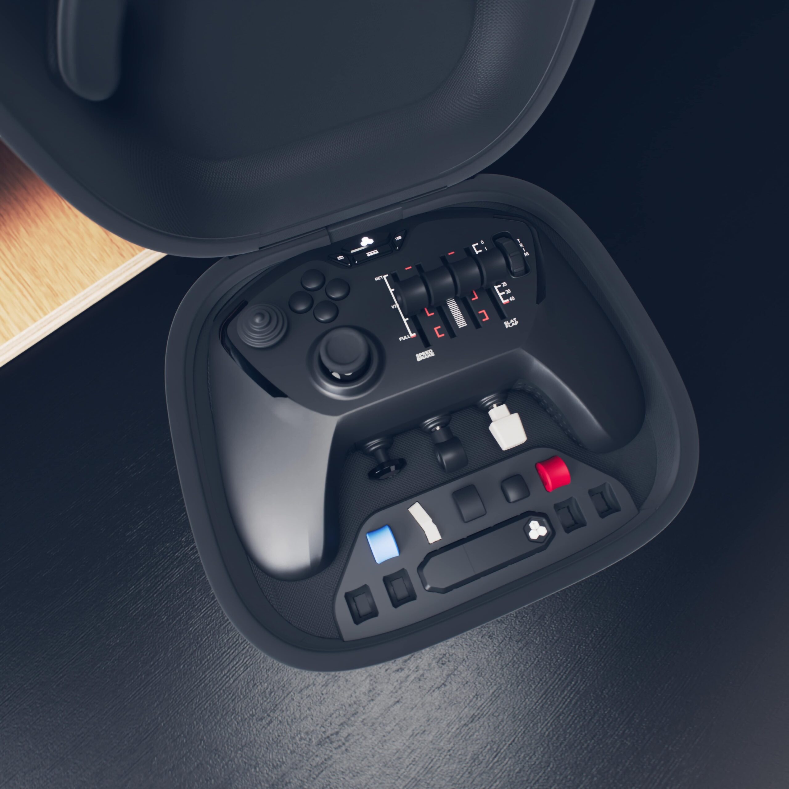 I like a good presentation when opening up premium hardware and Honeycomb does not disappoint. The box is magnetically sealed on the bottom and has a ribbon pull tab. Swing it up, and you are greeted with a sleek, grey zippered hard travel case with the logo stitched on to the top. Unzip the case and you have the controller, a USB wireless dongle, some alternate control caps that you can swap out for different aircraft styles, and a very nice thick braided USB cable in a mesh pocket attached to the lid.