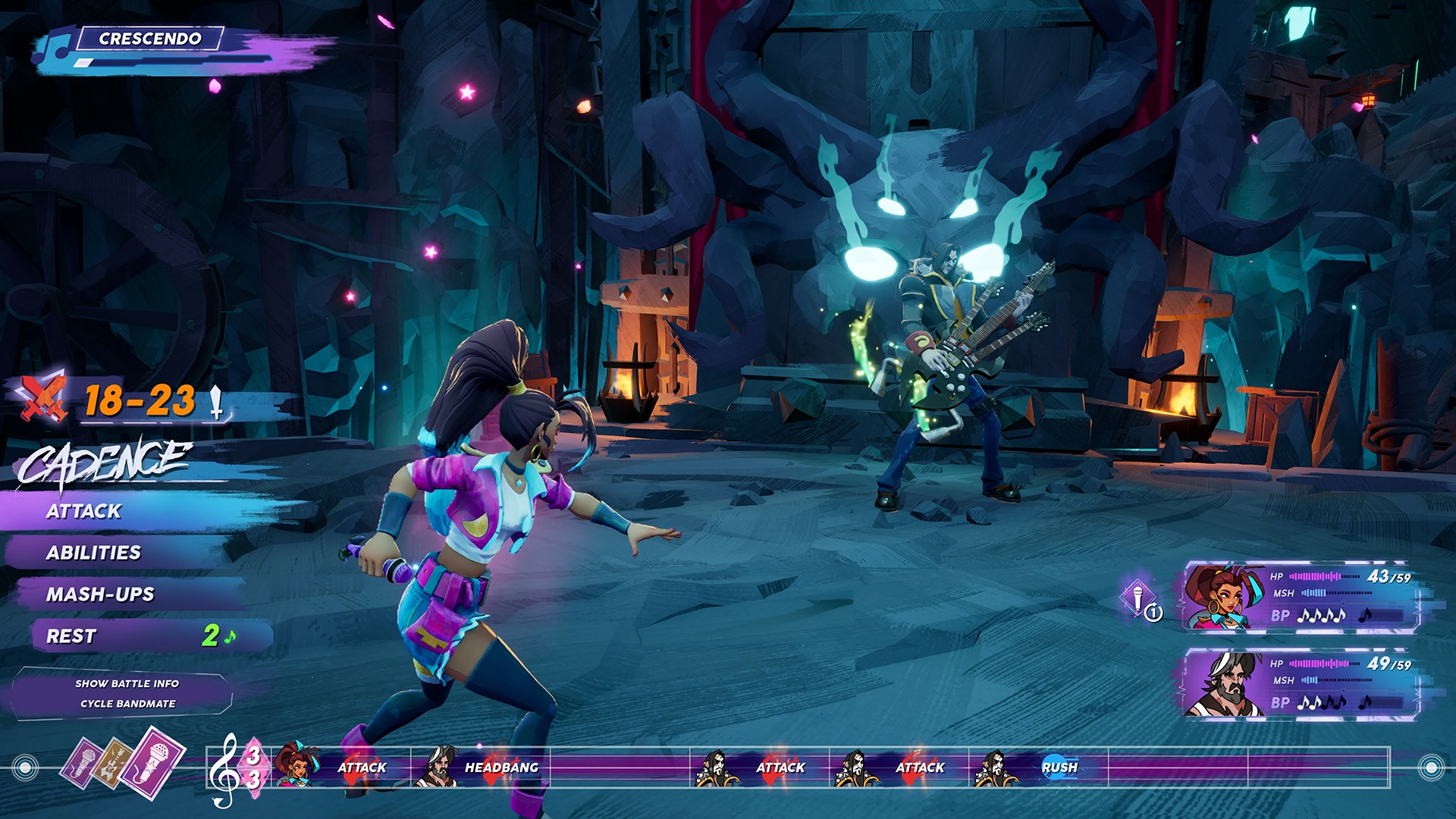 Combat is essential in any turn-based RPG, and People of Note is no exception. In many ways it’s your standard turn-based affair, and you won’t be surprised to see attacks come with small rhythm button presses for increased damage. Though in this case, it’s a stanza-based combat system, and each stanza comes with a genre attached. Not only does this remix the battle music; it provides a massive boost for the associated party member. Combined with the game’s Beat Points that slowly recharge each turn, there’s a decent amount of strategy involved in when to (or not to) use certain abilities. Do you waste the BP on a needed heal, or is it worth risking the damage because you know the next turn will let you unleash an extra devastating Pop attack?